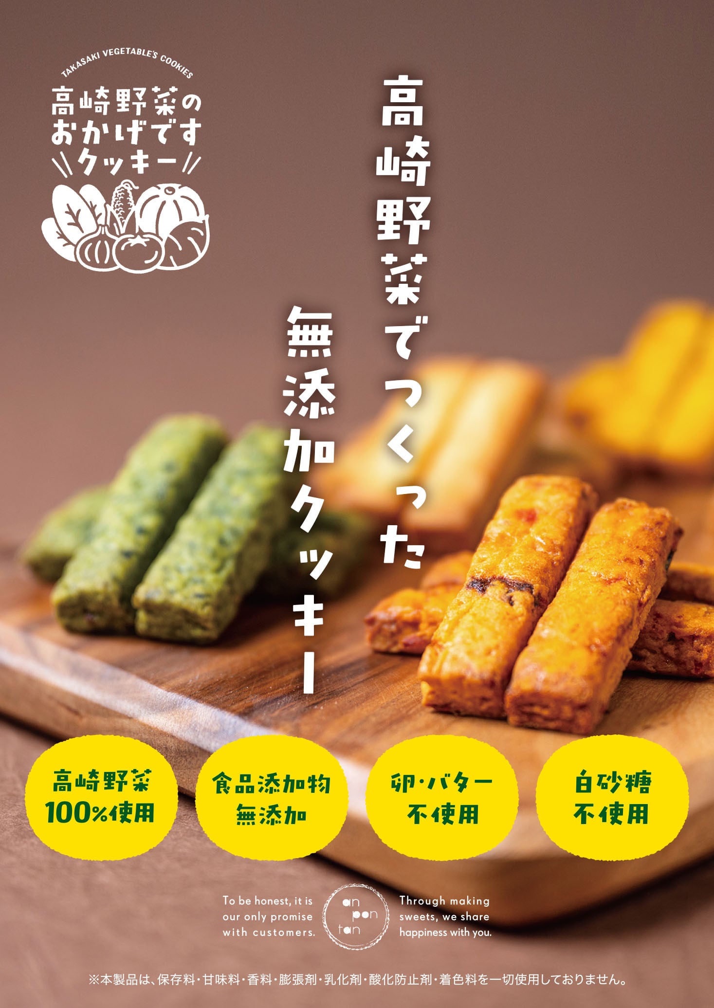 群馬県高崎市は、豊かな自然環境に恵まれ、年間を通して様々な種類の野菜が栽培されています。そんな高崎産の新鮮な野菜をたっぷり使用し、プラントベースのクッキーをお作りしました。